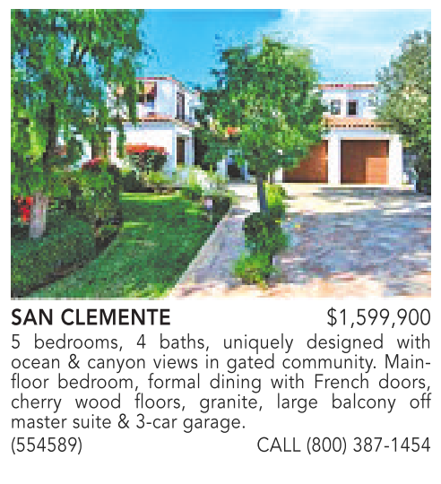 SAN CLEMENTE $1,599,900 5 bedrooms, 4 baths, uniquely designed with ocean & canyon views in gated community. Mainfloor bedroom, formal dining with French doors, cherry wood floors, granite, large balcony off master suite & 3-car garage. (554589) CALL (800) 387-1454