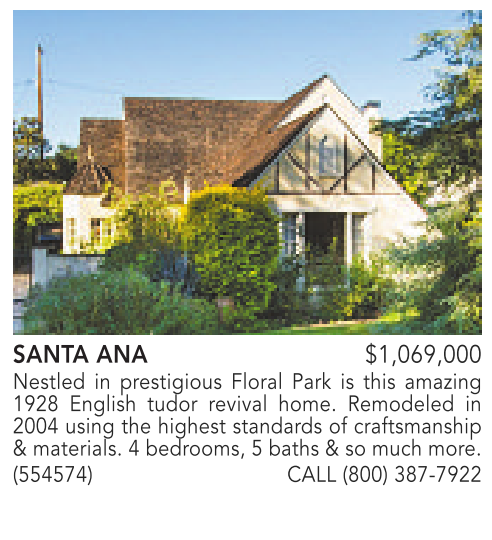 SANTA ANA $1,069,000 Nestled in prestigious Floral Park is this amazing 1928 English tudor revival home. Remodeled in 2004 using the highest standards of craftsmanship & materials. 4 bedrooms, 5 baths & so much more. (554574) CALL (800) 387-7922