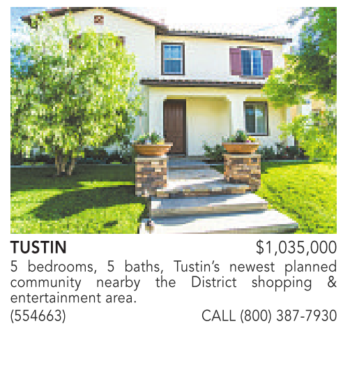 TUSTIN $1,035,000 5 bedrooms, 5 baths, Tustin’s newest planned community nearby the District shopping & entertainment area. (554663) CALL (800) 387-7930