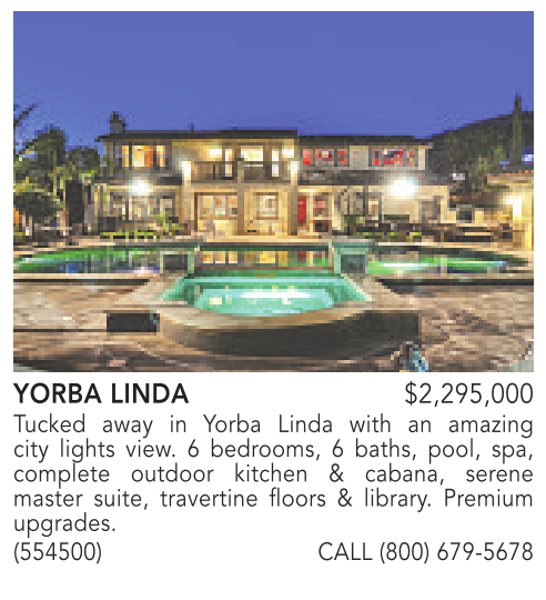YORBA LINDA $2,295,000 Tucked away in Yorba Linda with an amazing city lights view. 6 bedrooms, 6 baths, pool, spa, complete outdoor kitchen & cabana, serene master suite, travertine floors & library. Premium upgrades. (554500) CALL (800) 679-5678
