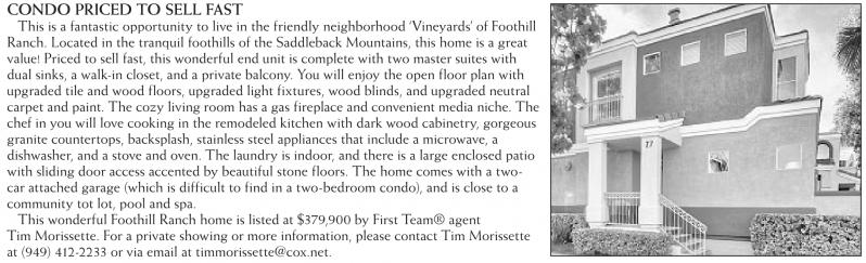 This wonderful Foothill Ranch home is listed at $379,900 by First Team® agent Tim Morissette. For a private showing or more information, please contact Tim Morissette at (949) 412-2233 or via email at timmorissette@cox.net.
