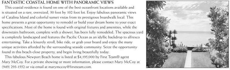 FANTASTIC COASTAL HOME WITH PANORAMIC VIEWS This coastal residence is found on one of the best oceanfront locations available and is situated on a rare, oversized, 30 foot by 102 foot lot. Enjoy fabulous panoramic views of Catalina Island and colorful sunset vistas from its prestigious boardwalk local. This home presents a great opportunity to remodel or build your dream home to your exact specifications. Most of the home is found with original fixtures and amenities, while the downstairs bathroom, complete with a shower, has been fully remodeled. The spacious yard is completely landscaped and features the Pacific Ocean as an idyllic backdrop to alfresco entertaining. Take a leisurely stroll, bike ride, or grab your board and enjoy the many unique activities afforded by the surrounding seaside community. Seize the opportunity found in this beach-close property, and begin living beautifully today. This fabulous Newport Beach home is listed at $4,195,000 by First Team® agent Mary McCoy. For a private showing or more information, please contact Mary McCoy at (949) 293-1552 or via email at marymccoy@firstteam.com.