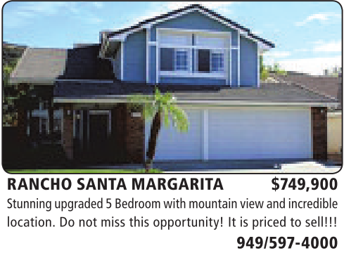 RANCHO SANTA MARGARITA $749,900 Stunningupgraded 5Bedroom with mountain view andincredible location. Do not miss this opportunity! It is priced tosell!!!