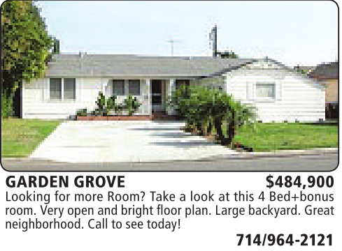 GARDEN GROVE $484,900 Looking for more Room? Take a look at this 4 Bed+bonus room. Very openand brightfloorplan. Largebackyard. Great neighborhood. Call to seetoday!