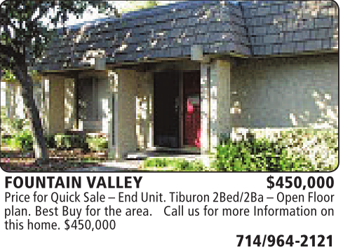 FOUNTAIN VALLEY $450,000 Pricefor QuickSale–End Unit.Tiburon 2Bed/2Ba –OpenFloor plan. Best Buy for the area. Call us for more Information on this home. $450,000 714/964-2121