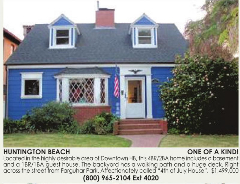 HUNTINGTON BEACH ONE OF A KIND! Located in the highly desirable area of Downtown HB, this 4BR/2BAhome includes abasement and a 1BR/1BA guest house. The backyard has a walking path and a huge deck. Right across the street from Farguhar Park. Affectionately called “4th of July House”. $1,499,000 (800) 965-2104 Ext 4020 See also