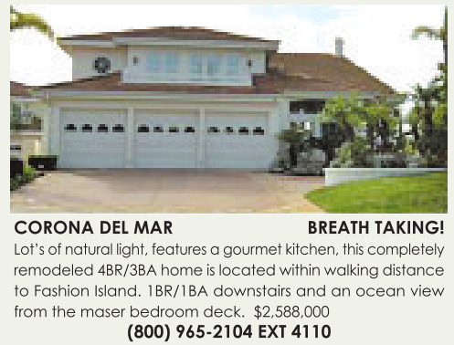 CORONA DEL MAR BREATH TAKING! Lot’s of natural light, features agourmet kitchen, this completely remodeled 4BR/3BA home is located within walking distance to Fashion Island. 1BR/1BA downstairs and an ocean view from the maser bedroom deck. $2,588,000 (800) 965-2104 EXT 4110