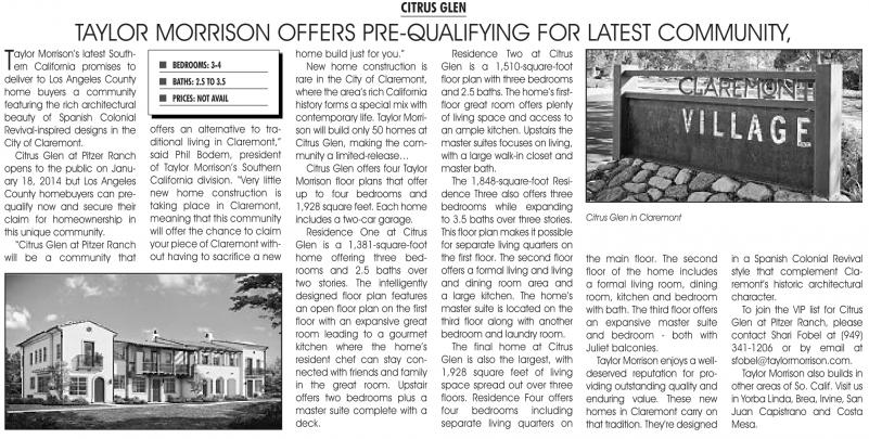 new home construction is rare in the City of Claremont, where the area’s rich California history forms a special mix with contemporary life. Taylor Morrison will build only 50 homes at Citrus Glen, making the community a limited-release… Citrus Glen offers four Taylor Morrison floor plans that offer up to four bedrooms and 1,928 square feet. each home includes a two-car garage.