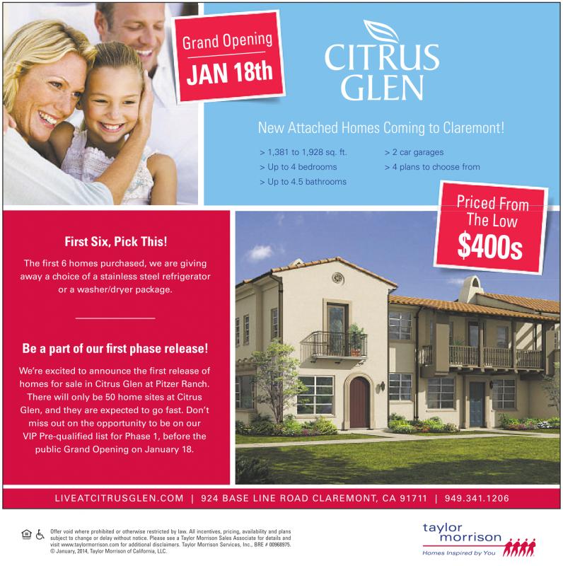 New Attached Homes Coming to Claremont! First Six, Pick This! The first 6 homes purchased, we are giving away a choice of a stainless steel refrigerator or a washer/dryer package. > 1,381 to 1,928 sq. ft. > Up to 4 bedrooms > Up to 4.5 bathrooms > 2 car garages > 4 plans to choose from Be a part of our first phase release! We’re excited to announce the first release of homes for sale in Citrus Glen at Pitzer Ranch. There will only be 50 home sites at Citrus Glen, and they are expected to go fast. Don’t miss out on the opportunity to be on our VIP Pre-qualified list for Phase 1, before the public Grand Opening on January 18. LIVEATCITRUSGLEN.COM | 924 BASE LINE ROAD CLAREMONT, CA 91711 | 949.341.1206 Offer void where prohibited or otherwise restricted by law. All incentives, pricing, availability and plans subject to change or delay without notice. Please see aTaylor Morrison Sales Associate for details and visit www.taylormorrison.com for additional disclaimers. Taylor Morrison Services, Inc., BRE #00968975. ©January,2014, Taylor Morrison of California, LLC.
