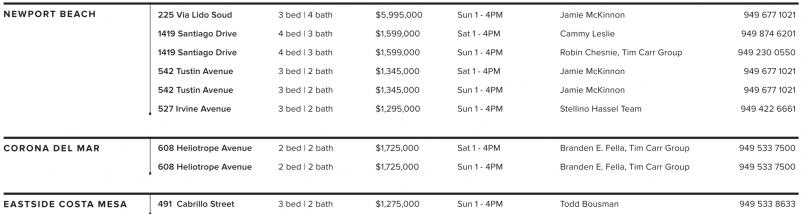 NEWPORT BEACH 225 Via Lido Soud 3 bed | 4 bath $5,995,000 Sun 1 - 4PM Jamie McKinnon 949 677 1021 1419 Santiago Drive 4 bed | 3 bath $1,599,000 Sat 1 - 4PM Cammy Leslie 949 874 6201 1419 Santiago Drive 4 bed | 3 bath $1,599,000 Sun 1 - 4PM Robin Chesnie, Tim Carr Group 949 230 0550 542 Tustin Avenue 3 bed | 2 bath $1,345,000 Sat 1 - 4PM Jamie McKinnon 949 677 1021 542 Tustin Avenue 3 bed | 2 bath $1,345,000 Sun 1 - 4PM Jamie McKinnon 949 677 1021 527 Irvine Avenue 3 bed | 2 bath $1,295,000 Sun 1 - 4PM Stellino Hassel Team 949 422 6661