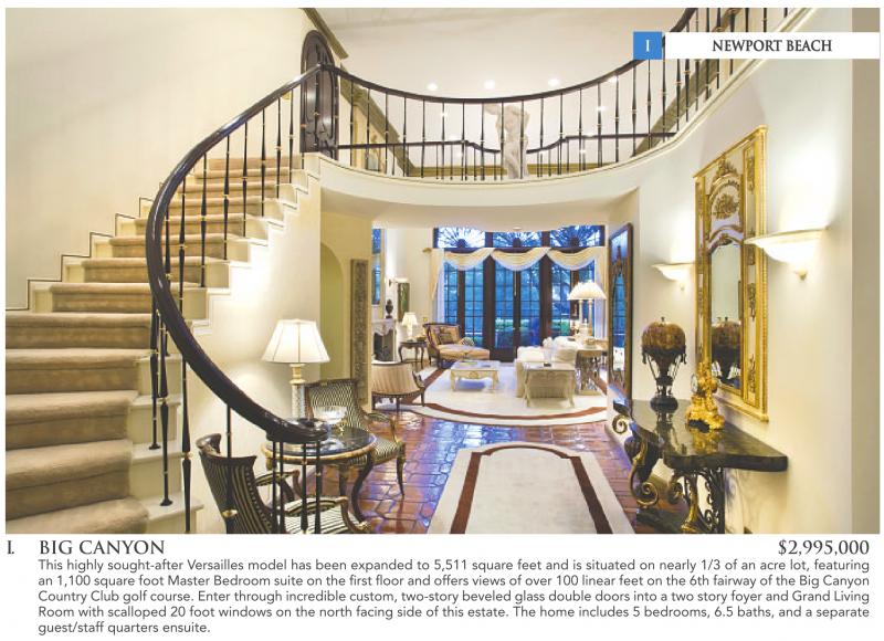 I NEWPORT BEACH I. BIG CANYON $2,995,000 This highly sought-after Versailles model has been expanded to 5,511 square feet and is situated on nearly 1/3 of an acre lot, featuring an 1,100 square foot Master Bedroom suite on the first floor and offers views of over 100 linear feet on the 6th fairway of the Big Canyon Country Club golf course. Enter through incredible custom, two-story beveled glass double doors into a two story foyer and Grand Living Room with scalloped 20 foot windows on the north facing side of this estate. The home includes 5 bedrooms, 6.5 baths, and a separate guest/staff quarters ensuite. See also