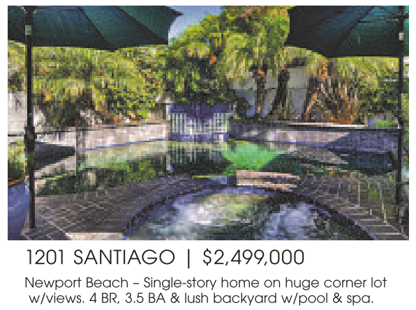 Newport Beach – Single-story home on huge corner lot w/views. 4 BR, 3.5 BA & lush backyard w/pool & spa.
