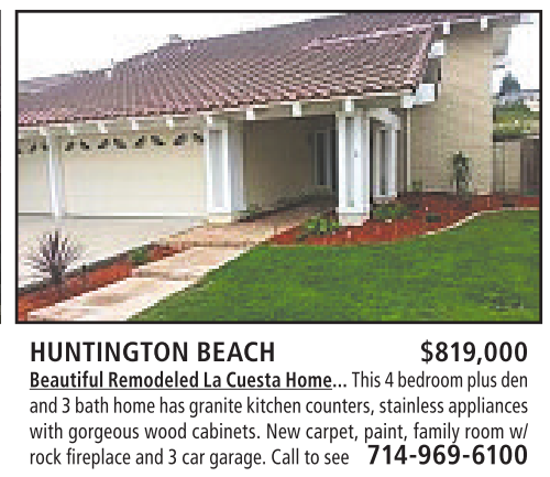 HUNTINGTON BEACH $819,000 BeautifulRemodeledLaCuestaHome... This 4bedroomplusden and3bathhome hasgranite kitchen counters, stainlessappliances with gorgeous wood cabinets. New carpet, paint, family room w/ rock fireplace and3car garage. Call to see 714-969-6100