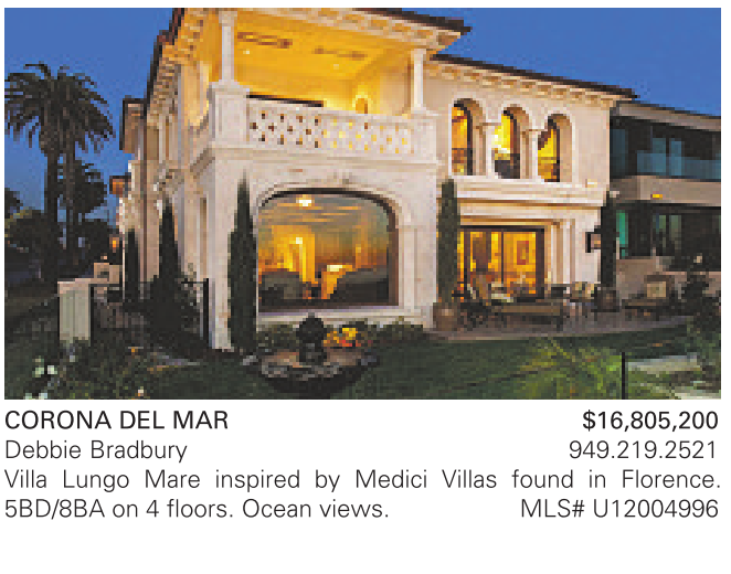 CORONA DEL MAR $16,805,200 Debbie Bradbury 949.219.2521 Villa Lungo Mare inspired by Medici Villas found in Florence. 5BD/8BA on 4 floors. Ocean views. MLS# U12004996
