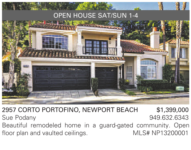 2957 CORTO PORTOFINO, NEWPORT BEACH $1,399,000 Sue Podany 949.632.6343 Beautiful remodeled home in a guard-gated community. Open floor plan and vaulted ceilings. MLS# NP13200001