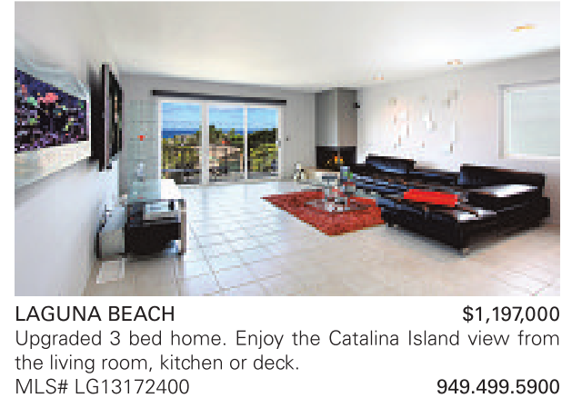 LaGuna Beach $1,197,000 Upgraded 3 bed home. Enjoy the Catalina Island view from the living room, kitchen or deck. MLS# LG13172400 949.499.5900