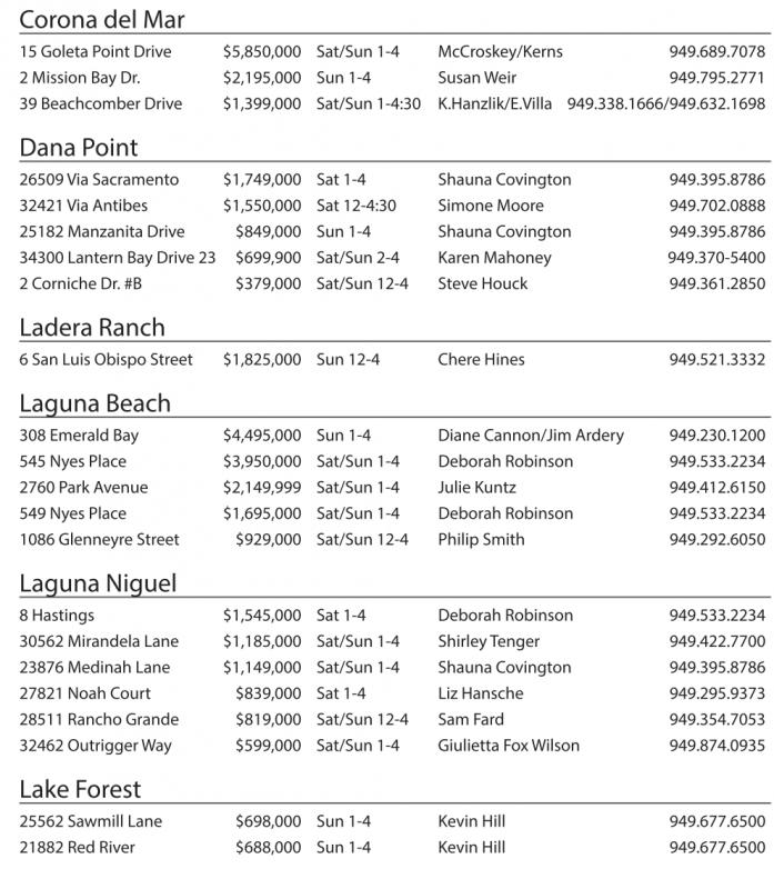 8Hastings $1,545,000 Sat 1-4 Deborah Robinson 949.533.2234 30562 Mirandela Lane $1,185,000 Sat/Sun 1-4 Shirley Tenger 949.422.7700 23876 Medinah Lane $1,149,000 Sat/Sun 1-4 Shauna Covington 949.395.8786 27821 Noah Court $839,000 Sat 1-4 Liz Hansche 949.295.9373 28511 Rancho Grande $819,000 Sat/Sun 12-4 Sam Fard 949.354.7053 32462 Outrigger Way $599,000 Sat/Sun 1-4 Giulietta FoxWilson 949.874.0935