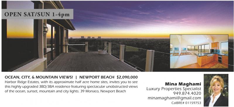 OPEN SAT/SUN 1-4pm OCEAN, CITY, & MOUNTAIN VIEWS! | NEWPORT BEACH $2,090,000 Harbor Ridge Estates, with its approximate half acre home sites, invites you to see this highly upgraded 3BD/3BA residence featuring spectacular unobstructed views of the ocean, sunset, mountain and city lights. 39 Monaco, Newport Beach Mina Maghami Luxury Properties Specialist 949.874.4020 minamaghami@gmail.com CalBRE# 01159753