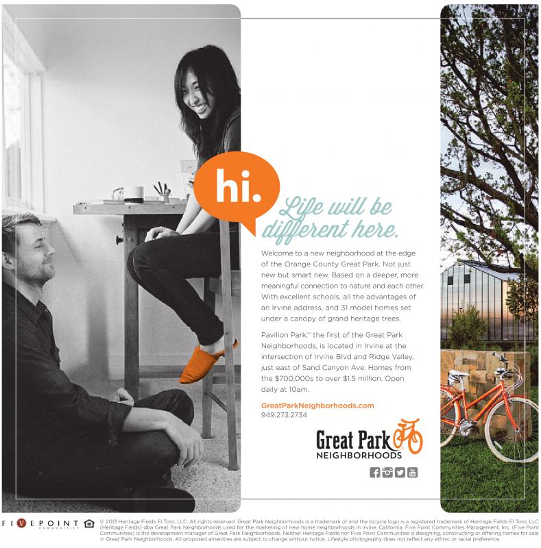 ©2013 Heritage Fields El Toro, LLC. All rights reserved. Great Park Neighborhoods is atrademark of and the bicycle logo is aregistered trademark of Heritage Fields El Toro, LLC (Heritage Fields) dba Great Park Neighborhoods used for the marketing of new home neighborhoods in Irvine, California. Five Point Communities Management, Inc. (Five Point Communities) isthe development manager of Great Park Neighborhoods. Neither Heritage Fields nor Five Point Communities is designing, constructing or offering homes for sale in Great Park Neighborhoods. All proposed amenities are subject to change without notice. Lifestyle photography does not reflect any ethnic or racial preference.