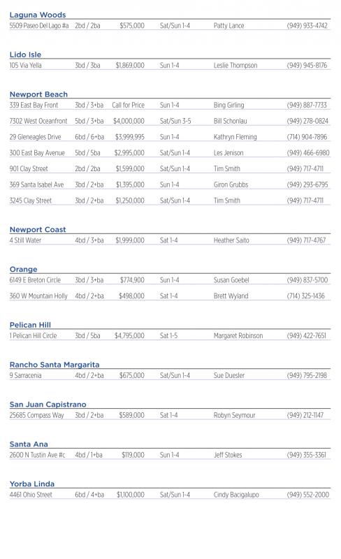 Newport Beach 339EastBay Front 3bd /3+ba Call forPrice Sun 1-4 Bing Girling (949) 887-7733 7302 West Oceanfront 5bd /3+ba $4,000,000 Sat/Sun 3-5 Bill Schonlau (949) 278-0824 29 Gleneagles Drive 6bd /6+ba $3,999,995 Sun 1-4 Kathryn Fleming (714) 904-7896 300 EastBay Avenue 5bd /5ba $2,995,000 Sat/Sun 1-4 LesJenison (949) 466-6980 901ClayStreet 2bd /2ba $1,599,000 Sat/Sun 1-4 TimSmith (949) 717-4711 369Santa Isabel Ave 3bd /2+ba $1,395,000 Sun 1-4 Giron Grubbs (949) 293-6795 3245 ClayStreet 3bd /2+ba $1,250,000 Sat/Sun 1-4 TimSmith (949) 717-4711