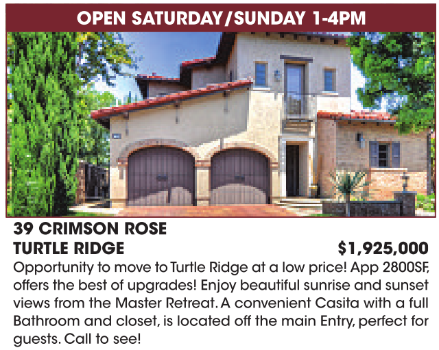 OPEN SATURDAY/SUNDAY 1-4PM 39 CRIMSON ROSE TURTLE RIDGE $1,925,000 Opportunity to move to Turtle Ridge at alow price! App 2800SF, offers the best of upgrades! Enjoy beautiful sunrise and sunset views from the Master Retreat.A convenient Casita with a full Bathroom and closet, is located off the main Entry, perfect for guests.Call to see! See also
