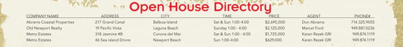 Abrams Coastal Properties 217 Grand Canal Balboa Island Sat &Sun 1:00-4:00 $2,695,000 Don Abrams 714.325.9055 Old Newport Realty 19 Pacific Vista Laguna Beach Sunday 1:00 -4:00 $2,125,000 Marcel Ford 949.887.0236 Metro Estates 318 Jasmine #B Corona del Mar Sat &Sun 1:00 -4:00 $1,725,000 Karen Rezek GRI 949.874.1119 Metro Estates 46Sea island Drivre Newport Beach Sun 1:00-4:00 $629,000 Karen Rezek GRI 949.874.1119