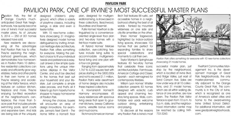 successful master plan, just stop by the neighborhood, which is located at irvine Blvd. and ridge Valley, just east of Sand canyon ave. Sales are now under way at all 10 collections, and 31 model homes, which are all within walking distance of one another, are now open. The pavilion park Visitor Terrace is open from 10 a.m. to 5p.m. daily, and the neighborhood information center may be reached by calling 949- 733-3260.