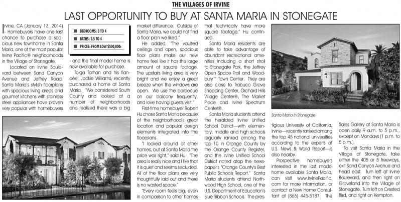 ca (January 13, 2014) - Homebuyers have one last chance to purchase a spacious new townhome in Santa