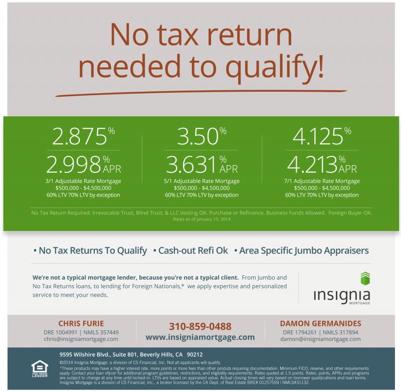©2014 Insignia Mortgage, a division of CS Financial, Inc. Not all applicants will qualify. *These products may have ahigher interest rate, more points or more fees than other produts requiring documentation. Minimum FICO, reserve, and other requirements apply. Contact your loan ofÿcer for additional program guidelines, restrictions, and eligibility requirements. Rates quoted at 1.5 points. Rates, points, APRs and programs are subject to change at any time until locked-in. LTVs are based on appraised value. Actual closing times will vary based on borrower qualiÿcations and loan terms. Insignia Mortgage is a division of CS Financial, Inc., a broker licensed by the CA Dept. of Real Estate BRE# 01257559 | NMLS#31132.