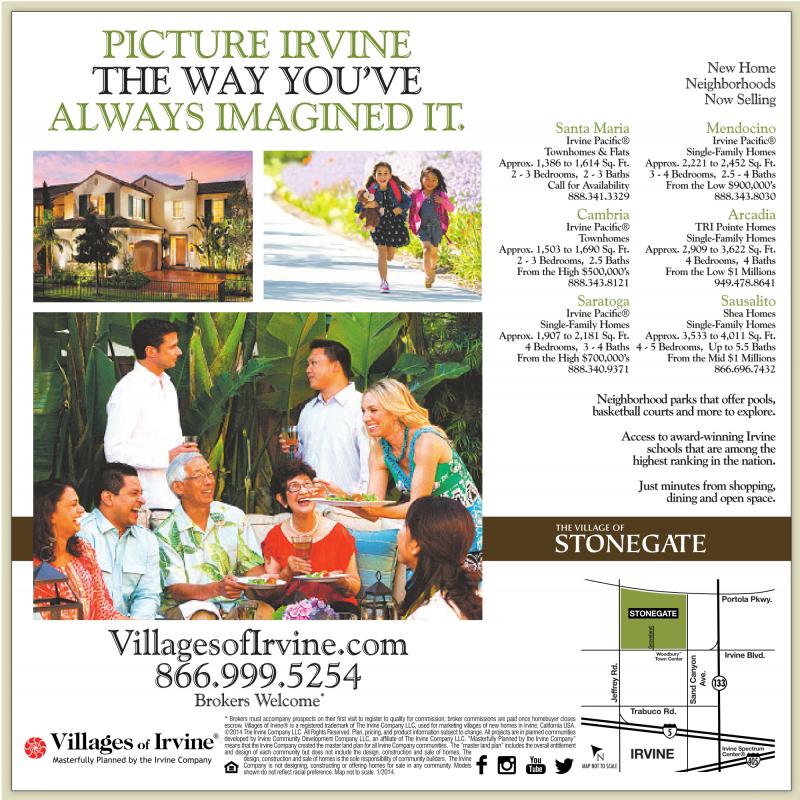*Brokers must accompany prospects on their first visit to register to quality for commission; broker commissions are paid once homebuyer closes escrow.Villages of Irvine® is aregistered trademark of The Irvine Company LLC, used for marketing villages of new homes in Irvine, California USA. ©2014 The Irvine Company LLC. All Rights Reserved. Plan, pricing, and product information subject to change. All projects are in planned communities developed by Irvine Community Development Company LLC, an affiliate of The Irvine Company LLC. “Masterfully Planned by the Irvine Company” means that the Irvine Company created the master land plan for all Irvine Company communities. The “master land plan” includes the overall entitlement and design of each community but does not include the design, construction and sale of homes. The design, construction and sale of homes is the sole responsibility of community builders. The Irvine Company is not designing, constructing or offering homes for sale in any community. Models shown do not reflect racial preference. Map not to scale. 1/2014.