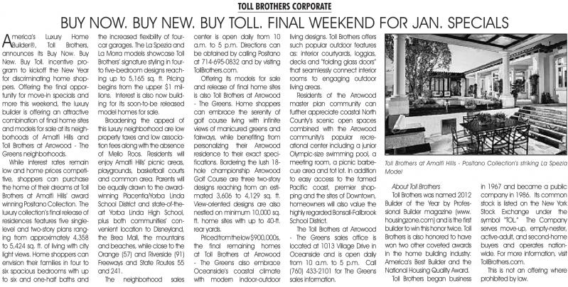 to kickoff the New Year for discriminating home shoppers. Offering the final opportunity for move-in specials and more this weekend, the luxury builder is offering an attractive combination of final home sites and models for sale at its neighborhoods of Amalfi Hills and Toll Brothers at Arrowood - The Greens neighborhoods.