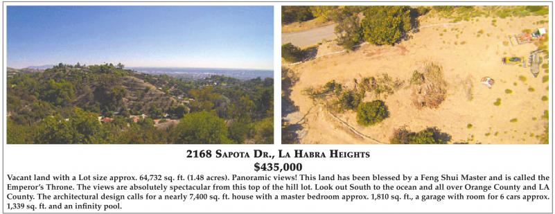 2168 SAPOTA DR., LA HABRA HEIGHTS $435,000 Vacant land with a Lot size approx. 64,732 sq. ft. (1.48 acres). Panoramic views! This land has been blessed by a Feng Shui Master and is called the Emperor’s Throne. The views are absolutely spectacular from this top of the hill lot. Look out South to the ocean and all over Orange County and LA County. The architectural design calls for a nearly 7,400 sq. ft. house with a master bedroom approx. 1,810 sq. ft., a garage with room for 6 cars approx. 1,339 sq. ft. and an infinity pool.
