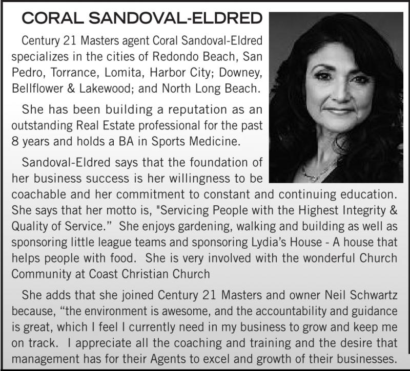 Century 21 Masters agent Coral Sandoval-Eldred specializes in the cities of Redondo Beach, San Pedro, Torrance, Lomita, Harbor City; Downey, Bellflower & Lakewood; and North Long Beach.