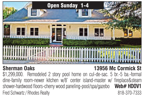 Sherman Oaks Open Sunday 1-4 13956 Mc Cormick St $1,299,000. Remodeled 2 story pool home on cul-de-sac. 5 br.-5 ba.-formal dine-family room-newer kitchen w/8’ center island-master w/ fireplace&steam shower-hardwood floors-cherry wood paneling-pool/spa/gazebo Web# HDOV1 Fred Schwartz /Rhodes Realty 818-370-7333