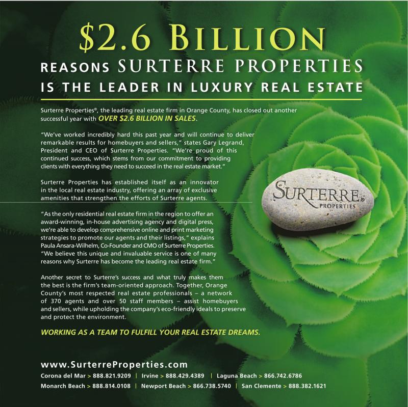 Another secret to Surterre’s success and what truly makes them the best is the firm’s team-oriented approach. Together, Orange County’s most respected real estate professionals – a network of 370 agents and over 50 staff members – assist homebuyers and sellers, while upholding the company’s eco-friendly ideals to preserve and protect the environment.