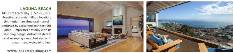 LAGUNA BEACH 1413 Emerald Bay | $7,995,000 Boasting a premier hilltop location, this modern architectural marvel – designed by acclaimed architect Eric Olsen – impresses not only with its stunning design, distinctive details and sweeping views, but also with its warm and welcoming feel. www.1413EmeraldBay.com