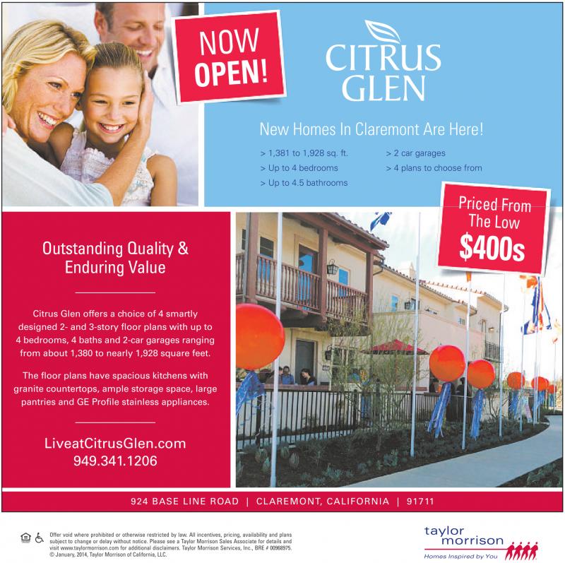 New Homes In Claremont Are Here! > 1,381 to 1,928 sq. ft. > Up to 4 bedrooms > 2 car garages > 4 plans to choose from > Up to 4.5 bathrooms Outstanding Quality & Enduring Value Citrus Glen offers a choice of 4 smartly designed 2- and 3-story floor plans with up to 4 bedrooms, 4 baths and 2-car garages ranging from about 1,380 to nearly 1,928 square feet. The floor plans have spacious kitchens with granite countertops, ample storage space, large pantries and GE Profile stainless appliances. LiveatCitrusGlen.com 949.341.1206 924 BASE LINE ROAD | CLAREMONT, CALIFORNIA | 91711 Offer void where prohibited or otherwise restricted by law. All incentives, pricing, availability and plans subject to change or delay without notice. Please see aTaylor Morrison Sales Associate for details and visit www.taylormorrison.com for additional disclaimers. Taylor Morrison Services, Inc., BRE #00968975. ©January,2014, Taylor Morrison of California, LLC.