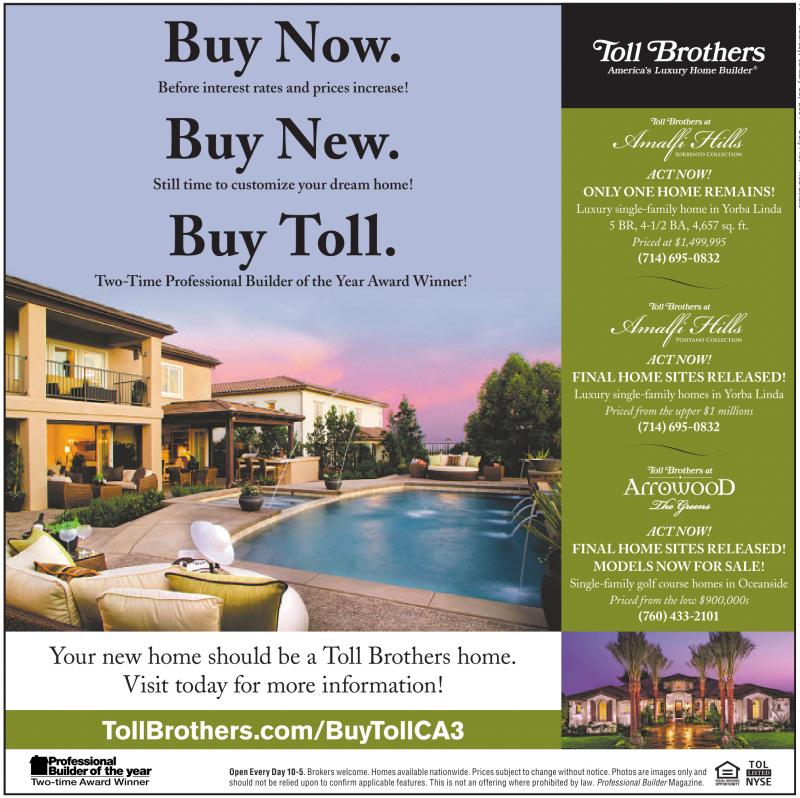 13 Buy Now. Before interest rates and prices increase! Buy New. Still time to customize your dream home! Buy Toll. ACT NOW! ONLY ONE HOME REMAINS! Luxury single-family home in Yorba Linda 5 BR, 4-1/2 BA, 4,657 sq. ft. Priced at $1,499,995 (714) 695-0832 Two-Time Professional Builder of the Year Award Winner! * ACT NOW! FINAL HOME SITES RELEASED! Luxury single-family homes in Yorba Linda Priced from the upper $1 millions (714) 695-0832 Your new home should be a Toll Brothers home. Visit today for more information! TollBrothers.com/BuyTollCA3 ACT NOW! FINAL HOME SITES RELEASED! MODELS NOW FOR SALE! Single-family golf course homes in Oceanside Priced from the low $900,000s (760) 433-2101 Open EveryDay 10-5.Brokers welcome.Homes availablenationwide.Pricessubjecttochangewithout notice.Photosare images only and should not berelied upon to confirm applicablefeatures. This is not anoffering where prohibited by law. Professional Builder Magazine.