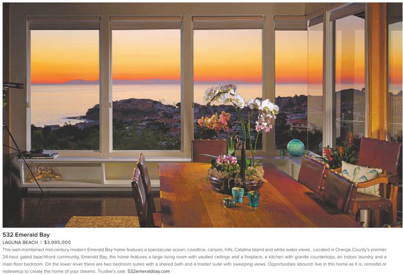 LAGUNA BEACH | $3,995,000 This well-maintained mid-century modern Emerald Bay home features aspectacular ocean, coastline,canyon, hills, Catalina Island and white water views .Located in Orange County’spremier 24-hour gated beachfront community, Emerald Bay, the home features a large living room with vaulted ceilings and a fireplace, a kitchen with granite countertops, an indoor laundry and a main floor bedroom. On the lower lever there are two bedroom suites with a shared bath and a master suite with sweeping views. Opportunities abound: live in this home as it is, remodel or redevelop to create the home of your dreams. Trustee’s sale. 532emeraldbay.com