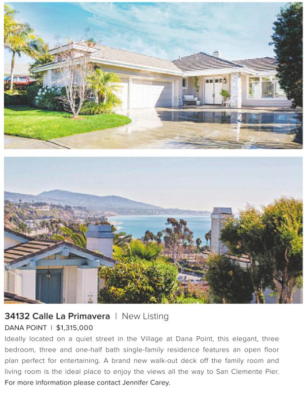 34132 Calle La Primavera | New Listing DANA POINT | $1,315,000 Ideally located on a quiet street in the Village at Dana Point, this elegant, three bedroom, three and one-half bath single-family residence features an open floor plan perfect for entertaining. A brand new walk-out deck off the family room and living room is the ideal place to enjoy the views all the way to San Clemente Pier. For more information please contact Jennifer Carey.