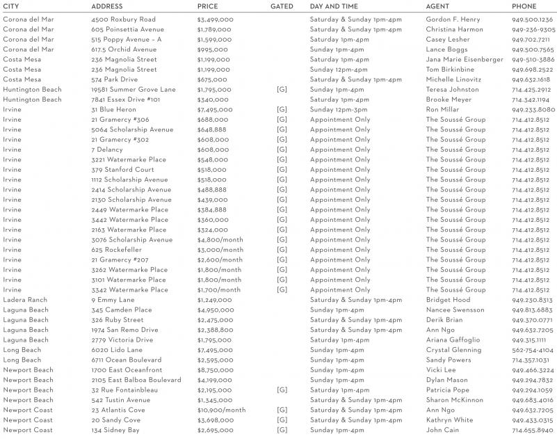 Corona del Mar 4500 Roxbury Road $3,499,000 Saturday & Sunday 1pm-4pm Gordon F. Henry 949.500.1236 Corona del Mar 605 Poinsettia Avenue $1,789,000 Saturday & Sunday 1pm-4pm Christina Harmon 949-236-9305 Corona del Mar 515 Poppy Avenue – A $1,599,000 Saturday 1pm-4pm Casey Lesher 949.702.7211 Corona del Mar 617.5 Orchid Avenue $995,000 Sunday 1pm-4pm Lance Boggs 949.500.7565 Costa Mesa 236 Magnolia Street $1,199,000 Saturday 1pm-4pm Jana Marie Eisenberger 949-510-3886 Costa Mesa 236 Magnolia Street $1,199,000 Sunday 12pm-4pm Tom Birkinbine 949.698.2522 Costa Mesa 574 Park Drive $675,000 Saturday & Sunday 1pm-4pm Michelle Linovitz 949.632.1618 Huntington Beach 19581 Summer Grove Lane $1,795,000 [G] Sunday 1pm-4pm Teresa Johnston 714.425.2912 Huntington Beach 7841 Essex Drive #101 $340,000 Saturday 1pm-4pm Brooke Meyer 714.342.1194 Irvine 31 Blue Heron $7,495,000 [G] Sunday 12pm-3pm Ron Millar 949.233.8080 Irvine 21 Gramercy #306 $688,000 [G] Appointment Only The Soussé Group 714.412.8512 Irvine 5064 Scholarship Avenue $648,888 [G] Appointment Only The Soussé Group 714.412.8512 Irvine 21 Gramercy #302 $608,000 [G] Appointment Only The Soussé Group 714.412.8512 Irvine 7 Delancy $608,000 [G] Appointment Only The Soussé Group 714.412.8512 Irvine 3221 Watermarke Place $548,000 [G] Appointment Only The Soussé Group 714.412.8512 Irvine 379 Stanford Court $518,000 [G] Appointment Only The Soussé Group 714.412.8512 Irvine 1112 Scholarship Avenue $518,000 [G] Appointment Only The Soussé Group 714.412.8512 Irvine 2414 Scholarship Avenue $488,888 [G] Appointment Only The Soussé Group 714.412.8512 Irvine 2130 Scholarship Avenue $439,000 [G] Appointment Only The Soussé Group 714.412.8512 Irvine 2449 Watermarke Place $384,888 [G] Appointment Only The Soussé Group 714.412.8512 Irvine 3442 Watermarke Place $360,000 [G] Appointment Only The Soussé Group 714.412.8512 Irvine 2163 Watermarke Place $324,000 [G] Appointment Only The Soussé Group 714.412.8512 Irvine 3076 Scholarship Avenue $4,800/month [G] Appointment Only The Soussé Group 714.412.8512 Irvine 625 Rockefeller $3,000/month [G] Appointment Only The Soussé Group 714.412.8512 Irvine 21 Gramercy #207 $2,600/month [G] Appointment Only The Soussé Group 714.412.8512 Irvine 3262 Watermarke Place $1,800/month [G] Appointment Only The Soussé Group 714.412.8512 Irvine 3101 Watermarke Place $1,800/month [G] Appointment Only The Soussé Group 714.412.8512 Irvine 3342 Watermarke Place $1,700/month [G] Appointment Only The Soussé Group 714.412.8512 Ladera Ranch 9 Emmy Lane $1,249,000 Saturday & Sunday 1pm-4pm Bridget Hood 949.230.8313 Laguna Beach 345 Camden Place $4,950,000 Sunday 1pm-4pm Nancee Swensson 949.813.6883 Laguna Beach 326 Ruby Street $2,475,000 Saturday & Sunday 1pm-4pm Derik Brian 949.370.0771 Laguna Beach 1974 San Remo Drive $2,388,800 Saturday & Sunday 1pm-4pm Ann Ngo 949.632.7205 Laguna Beach 2779 Victoria Drive $1,795,000 Saturday 1pm-4pm Ariana Gaffoglio 949.315.1111 Long Beach 6020 Lido Lane $7,495,000 Sunday 1pm-4pm Crystal Glenning 562-754-4104 Long Beach 6711 Ocean Boulevard $2,595,000 Sunday 1pm-4pm Sandy Powers 714.357.1031 Newport Beach 1700 East Oceanfront $8,750,000 Sunday 1pm-4pm Vicki Lee 949.466.3224 Newport Beach 2105 East Balboa Boulevard $4,199,000 Sunday 1pm-4pm Dylan Mason 949.294.7832 Newport Beach 32 Rue Fontainbleau $2,195,000 [G] Saturday 1pm-4pm Patricia Pope 949.294.1059 Newport Beach 542 Tustin Avenue $1,345,000 Saturday & Sunday 1pm-4pm Sharon McKinnon 949.683.4016 Newport Coast 23 Atlantis Cove $10,900/month [G] Saturday & Sunday 1pm-4pm Ann Ngo 949.632.7205 Newport Coast 20 Sandy Cove $3,698,000 [G] Saturday & Sunday 1pm-4pm Kathryn White 949.433.0315 Newport Coast 134 Sidney Bay $2,695,000 [G] Sunday 1pm-4pm John Cain 714.655.8940