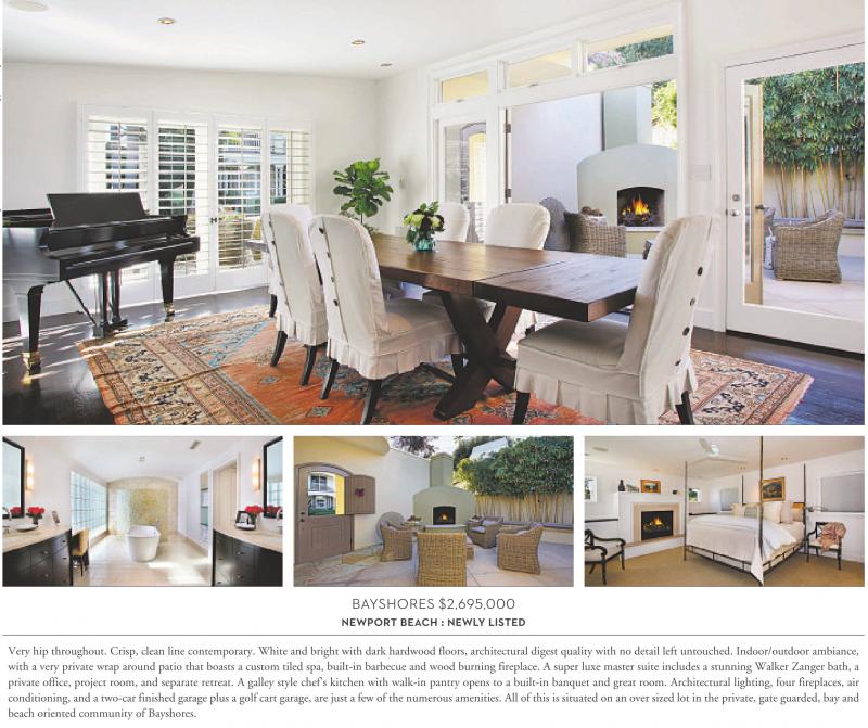 32 BAYSHORES $2,695,000 NEWPORT BEACH : NEWLY LISTED Very hip throughout. Crisp, clean line contemporary. White and bright with dark hardwood floors, architectural digest quality with no detail left untouched. Indoor/outdoor ambiance, with a very private wrap around patio that boasts a custom tiled spa, built-in barbecue and wood burning fireplace. A super luxe master suite includes a stunning Walker Zanger bath, a private office, project room, and separate retreat. A galley style chef’s kitchen with walk-in pantry opens to a built-in banquet and great room. Architectural lighting, four fireplaces, air conditioning, and a two-car finished garage plus a golf cart garage, are just a few of the numerous amenities. All of this is situated on an over sized lot in the private, gate guarded, bay and beach oriented community of Bayshores.