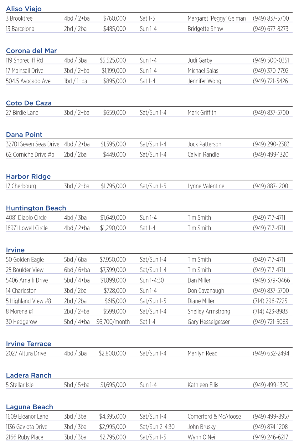 Laguna Beach 1609 Eleanor Lane 3bd /3ba $4,395,000 Sat/Sun 1-4 Comerford&McAfoose (949) 499-8957 1136 Gaviota Drive 3bd /3ba $2,995,000 Sat/Sun 2-4:30 John Brusky (949) 874-1208 2166 RubyPlace 3bd /3ba $2,795,000 Sat/Sun 1-5 Wynn O’Neill (949) 246-6217