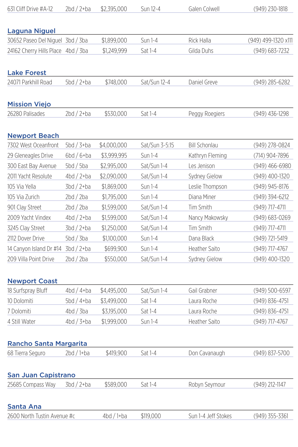 Newport Beach 7302 West Oceanfront 5bd /3+ba $4,000,000 Sat/Sun 3-5:15 Bill Schonlau (949) 278-0824 29 Gleneagles Drive 6bd /6+ba $3,999,995 Sun 1-4 Kathryn Fleming (714) 904-7896 300 EastBay Avenue 5bd /5ba $2,995,000 Sat/Sun 1-4 LesJenison (949) 466-6980 2011 YachtResolute 4bd /2+ba $2,090,000 Sat/Sun 1-4 SydneyGielow (949) 400-1320 105 ViaYella 3bd /2+ba $1,869,000 Sun 1-4 Leslie Thompson (949) 945-8176 105 ViaZurich 2bd /2ba $1,795,000 Sun 1-4 Diana Miner (949) 394-6212 901ClayStreet 2bd /2ba $1,599,000 Sat/Sun 1-4 TimSmith (949) 717-4711 2009 YachtVindex 4bd /2+ba $1,599,000 Sat/Sun 1-4 NancyMakowsky (949) 683-0269 3245 ClayStreet 3bd /2+ba $1,250,000 Sat/Sun 1-4 TimSmith (949) 717-4711 2112 DoverDrive 5bd /3ba $1,100,000 Sun 1-4 Dana Black (949) 721-5419 14 CanyonIsland Dr #14 3bd /2+ba $699,900 Sun 1-4 Heather Saito (949) 717-4767 209 Villa PointDrive 2bd /2ba $550,000 Sat/Sun 1-4 SydneyGielow (949) 400-1320