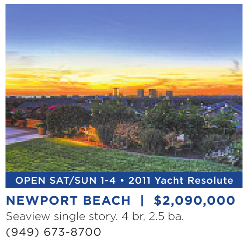 OPEN SAT/SUN 1-4 • 2011 Yacht Resolute NEWPORT BEACH | $2,090,000 Seaview single story. 4 br, 2.5 ba. (949) 673-8700