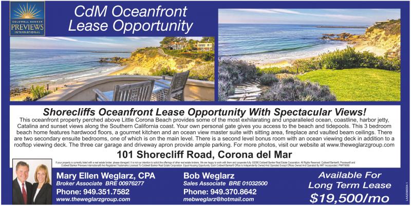CdM Oceanfront Lease Opportunity Shorecliffs Oceanfront Lease Opportunity With Spectacular Views! This oceanfront property perched above Little Corona Beach provides some of the most exhilarating and unparalleled ocean, coastline, harbor jetty, Catalina and sunset views along the Southern California coast. Your own personal gate gives you access to the beach and tidepools. This 3 bedroom beach home features hardwood floors, a gourmet kitchen and an ocean view master suite with sitting area, fireplace and vaulted beam ceilings. There are two secondary ensuite bedrooms, one of which is on the main level. There is a second level bonus room with an ocean viewing deck in addition to a rooftop viewing deck. The three car garage and driveway apron provide ample parking. For more photos, visit our website at www.theweglarzgroup.com 101 Shorecliff Road, Corona del Mar If your property is currently listed with areal estate broker, please disregard. It is not our intention to solicit the offerings of other real estate brokers. We are happy to work with them and cooperate fully. ©2006 Coldwell Banker Real Estate Corporation. All Rights Reserved. Coldwell Banker®, Previews® and Coldwell Banker Previews International® Are Registered Trademarks Licensed To Coldwell Banker Real Estate Corporation. Equal Housing Opportunity. Each Coldwell Banker® Office Is Independently Owned And Operated Except Offices Owned And Operated By NRT Incorporated. PNRT6990 Mary Ellen Weglarz, CPA Broker Associate BRE 00976277 Phone: 949.351.7582 www.theweglarzgroup.com Bob Weglarz Sales Associate BRE 01032500 Phone: 949.370.8642 mebweglarz@hotmail.com Available For Long Term Lease $19,500/mo