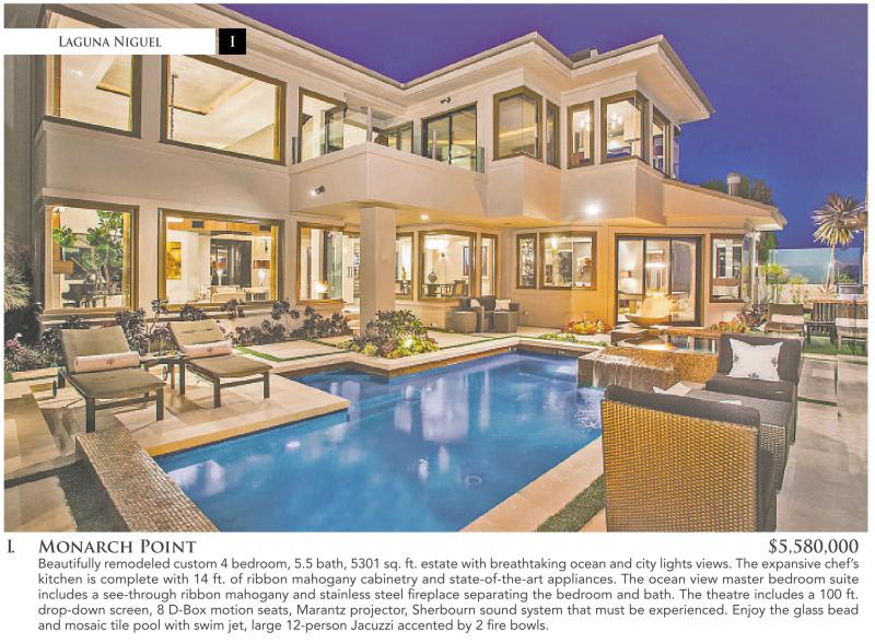 Laguna Niguel I I. Monarch Point $5,580,000 Beautifully remodeled custom 4 bedroom, 5.5 bath, 5301 sq. ft. estate with breathtaking ocean and city lights views. The expansive chef’s kitchen is complete with 14 ft. of ribbon mahogany cabinetry and state-of-the-art appliances. The ocean view master bedroom suite includes a see-through ribbon mahogany and stainless steel fireplace separating the bedroom and bath. The theatre includes a 100 ft. drop-down screen, 8 D-Box motion seats, Marantz projector, Sherbourn sound system that must be experienced. Enjoy the glass bead and mosaic tile pool with swim jet, large 12-person Jacuzzi accented by 2 fire bowls.