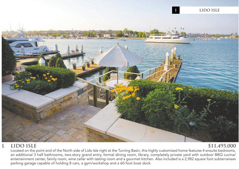 ILIDO ISLE I. LIDO ISLE $11,495,000 Located on the point end of the North side of Lido Isle right at the Turning Basin, this highly customized home features 4 ensuite bedrooms, an additional 3 half bathrooms, two-story grand entry, formal dining room, library, completely private yard with outdoor BBQ cucina/ entertainment center, family room, wine cellar with tasting room and a gourmet kitchen. Also included is a 2,982 square foot subterranean parking garage capable of holding 8 cars, a gym/workshop and a 60-foot boat dock.
