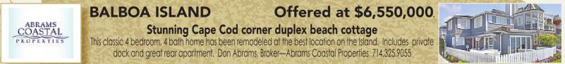 BALBOA ISLAND Offered at $6,550,000. Stunning Cape Cod corner duplex beach cottage This classic 4 bedroom, 4 bath home has been remodeled at the best location on the Island. Includes private dock and great rear apartment. Don Abrams, Broker—Abrams Coastal Properties 714.325.9055