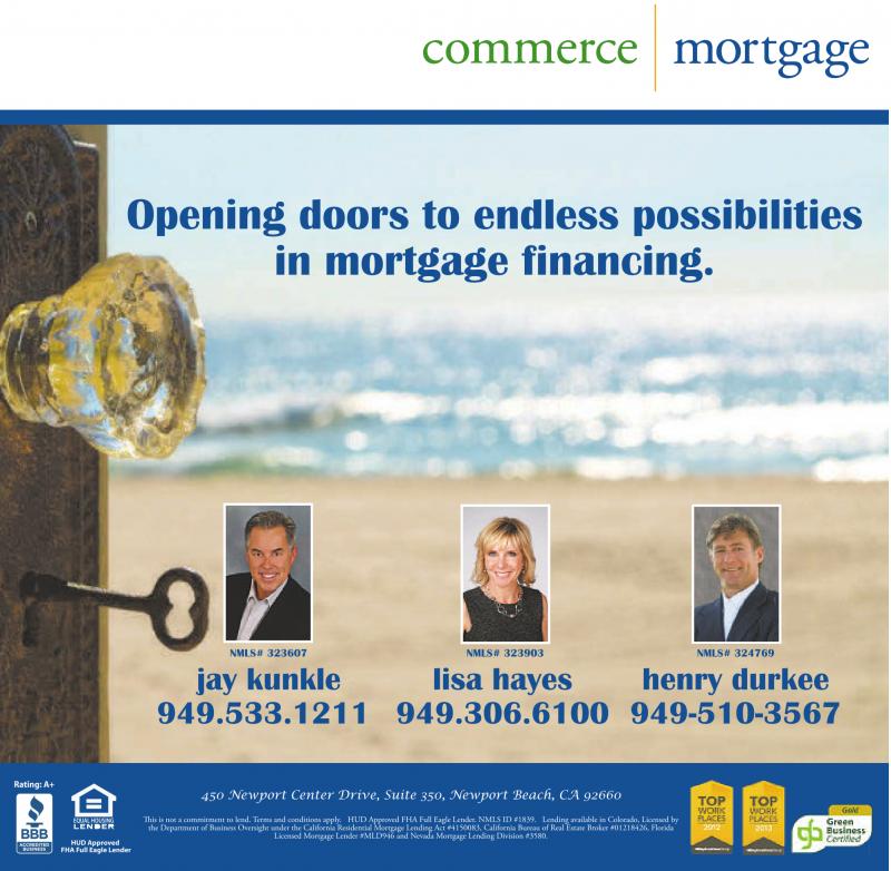 Opening doors to endless possibilities in mortgage financing. NMLS# 323607 jay kunkle 949.533.1211 NMLS# 323903 lisa hayes 949.306.6100 NMLS# 324769 henry durkee 949-510-3567 450 Newport Center Drive, Suite 350, Newport Beach, CA 92660 This is not acommitment to lend. Terms and conditions apply. HUD Approved FHA Full Eagle Lender.NMLS ID #1839. Lending available in Colorado, Licensed by the Department of Business Oversight under the California Residential Mortgage Lending Act#4150083, California Bureau of Real Estate Broker #01218426, Florida Licensed Mortgage Lender #MLD946 and Nevada Mortgage Lending Division #3580.